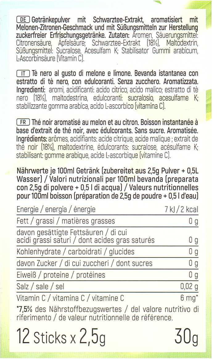 Zuckerfreies Instant-Getränk "Typ Eistee" mit Schwarztee-Extrakt und Melonen-Zitronen Geschmack